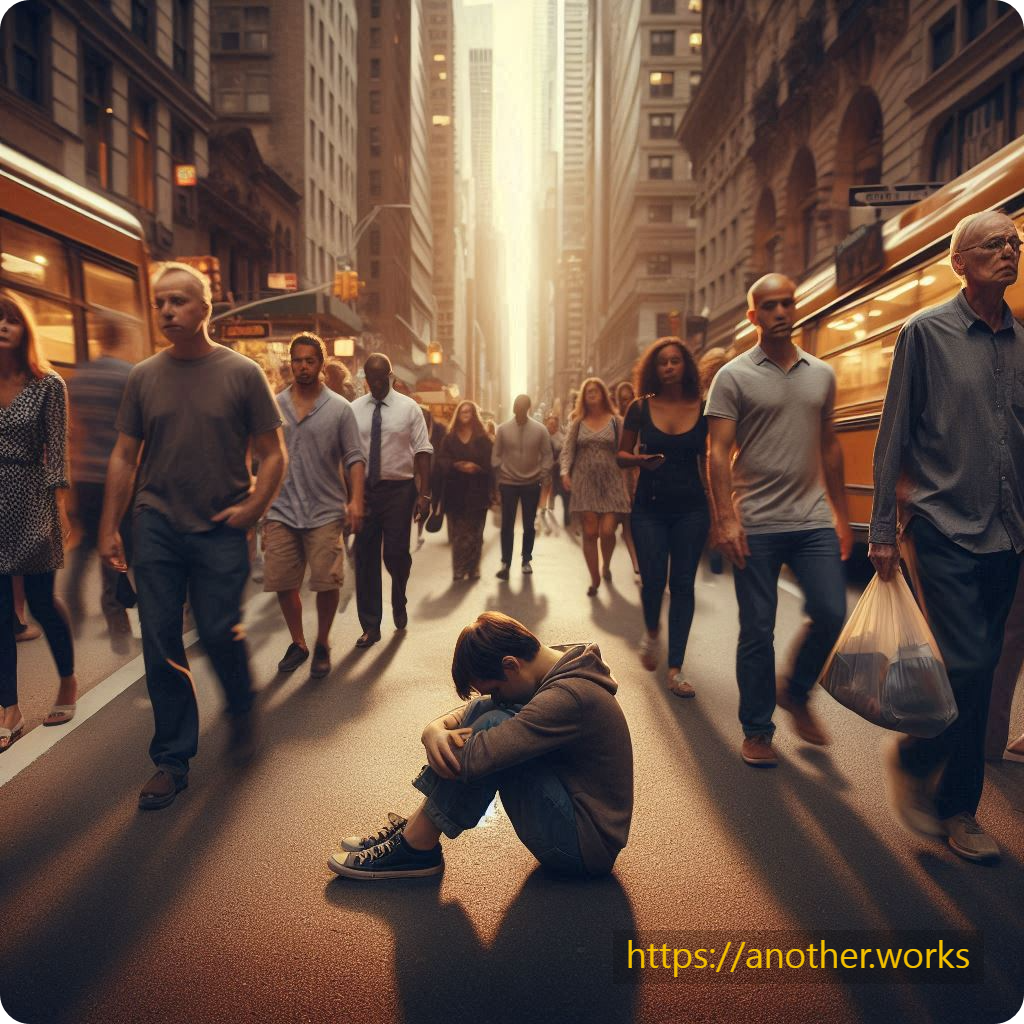 모두가 그 사람을 힐끗 바라보기만 하고 지나치는 장면.