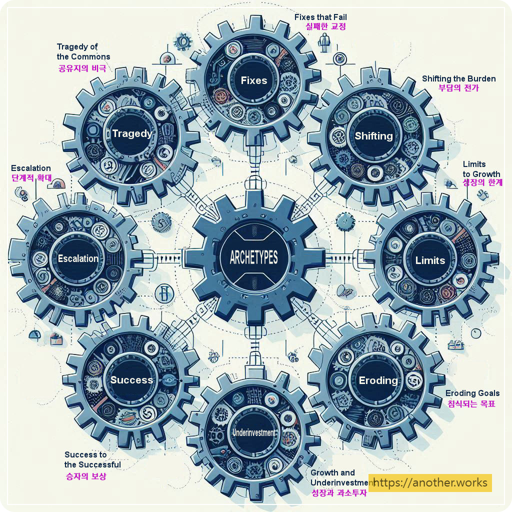 다음은 시스템 사고의 8가지 아케타입이 주식시장 내 어떤 구조와 연관되는지 정리한 예시입니다.