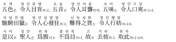 다섯 가지 색깔은 사람의 눈을 멀게 하고, 다섯 가지 소리는 사람의 귀를 먹게 하며, 다섯 가지 맛은 사람의 입맛을 상하게 한다. (지나친 자극은 감각을 무디게 함)