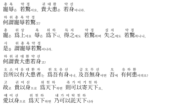 총애와 치욕은 놀라는 듯이 대하고, 큰 근심을 귀하게 여기는 것은 몸(자아)과 같이 여기기 때문이다.