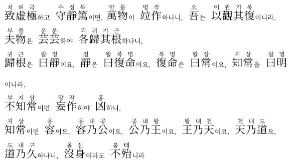대저 만물은 무성하게 일어나서 각각 그 뿌리로 돌아가니, 뿌리로 돌아감을 일러 고요함이라 하고, 고요함을 일러 명(생명)으로 돌아감이라 하며, 명으로 돌아감을 일러 영원한 도리라 하고, 영원한 도리를 아는 것을 일러 밝음이라 한다.