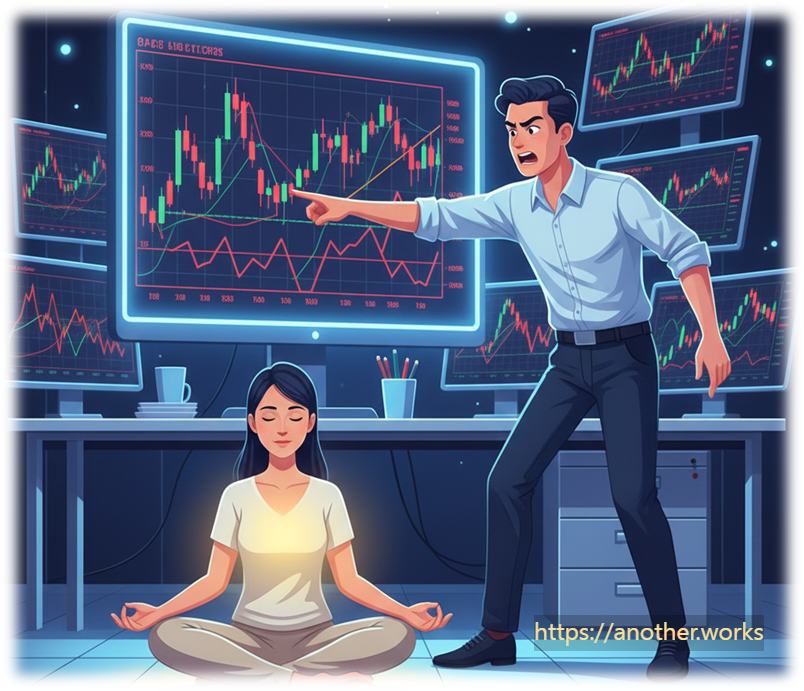 [Scene] 쉴 새 없이 돌아가는 주식 시장에 너무 몰입해 불안해하는 투자자(A), 템플 스테이 후 돌아와 평정심을 찾은 친구(B)의 대화.