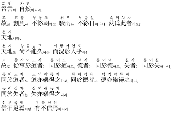 도와 하나가 된 자는 도 역시 기꺼이 그를 얻으려 하고, 덕과 하나가 된 자는 덕 역시 기꺼이 그를 얻으려 하며, 잃음과 하나가 된 자는 잃음 역시 기꺼이 그를 얻으려 한다.