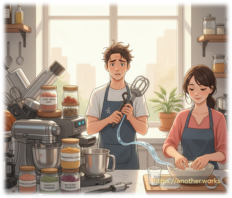 [Scene] 취미로 요리를 시작한 사람(A)이 너무 많은 고급 도구와 재료에 집착하며 요리를 복잡하게 만들자, 숙련된 요리사 친구(B)가 조언합니다.