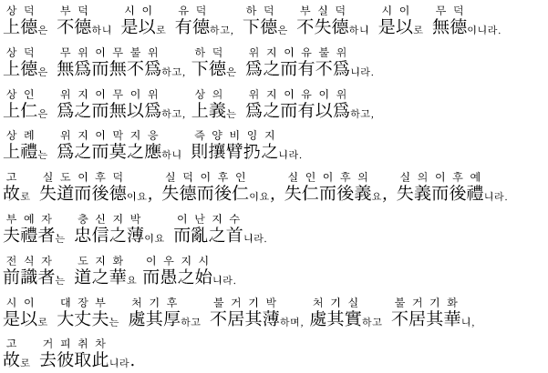 '그러므로 도를 잃은 뒤에야 덕'이 생겨났고, '덕을 잃은 뒤에야 인'이 생겨났으며, '인을 잃은 뒤에야 의'가 생겨났고, '의를 잃은 뒤에야 예'가 생겨났다.