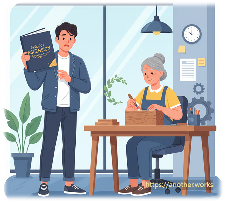 [Scene] 친구(A)가 자신의 성과를 화려하게 포장하여 상사에게 인정받으려 하자, 조용히 실력을 쌓아온 친구(B)가 노자의 조언을 건넵니다.