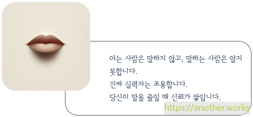 - 침묵의 지혜: 진정한 '도(道)'의 지혜는 언어의 범주를 초월하므로, 참으로 아는 자는 말을 아끼고, 오히려 말을 많이 하는 자는 피상적인 지식에 머물러 있습니다.