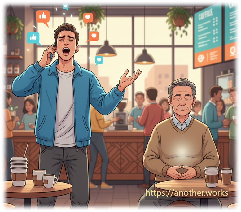 [Scene] 친구(A)가 온라인에서 자신의 모든 지식과 의견을 끊임없이 주장하려 하자, 조용히 관찰하는 친구(B)가 노자의 가르침을 조언합니다.