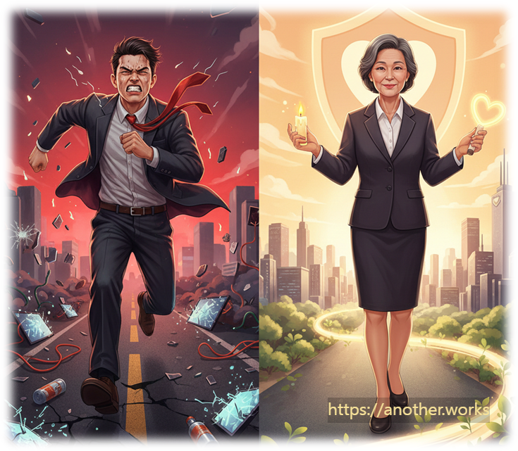 [Scene] 신세대 리더(A)가 공격적 마케팅과 과도한 지출, 개인 능력 과시를 통해 빠르게 성공하려 하자, 멘토(B)가 노자의 '세 가지 보물'을 제시합니다.