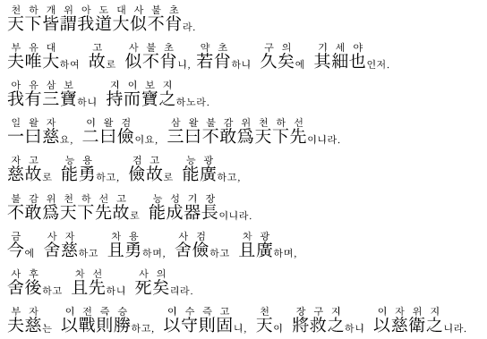 자비롭기 때문에 능히 용감할 수 있고, 검소하기 때문에 능히 넓게 베풀 수 있으며, 감히 천하에 앞서지 않기 때문에 능히 우두머리를 이룬다.