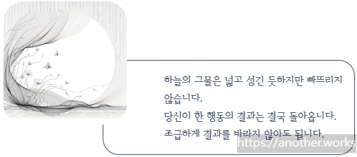- 天網恢恢 疎而不失(천망회회 소이불실) : 하늘의 그물은 넓고 성기나 놓침이 없음