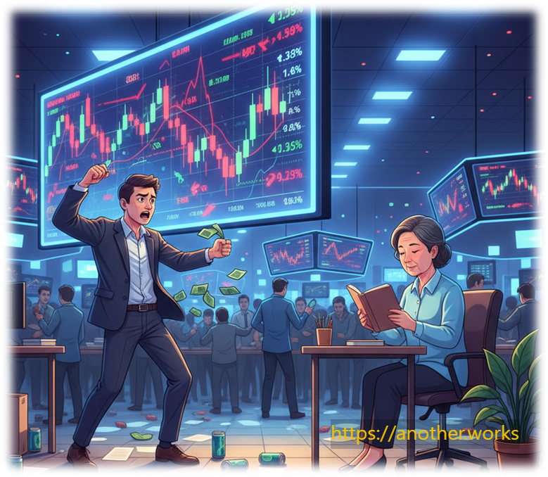 [Scene] 친구(A)가 리스크가 크더라도 공격적인 투자(勇於敢)를 통해 한 번에 성공하려 하자, 친구(B)가 노자의 '천도의 섭리'를 조언합니다.