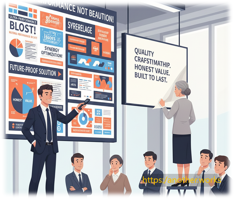 [Scene] 신제품 홍보 문구에 대해 회의하던 중, 화려한 미사여구를 쓰려는 마케터(A)에게 CEO(B)가 노자의 최종 가르침을 통해 조언합니다.