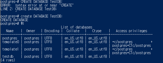 Postgres=# CREATE DATABASE testdb; # TestDB라는 이름의 데이터베이스 생성