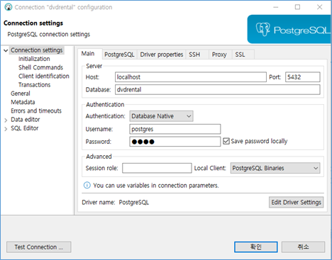 - 생성 시 입력했던 정보(testdb/postgres/4080)를 등록하고 [Test Connection] 클릭하여 정상 접속을 확인한다.