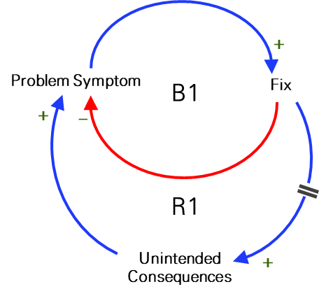 이 원형은 신속한 해결책quick-fix solution은 문제를 악화시키는 의도하지 않은 결과를 가져올 수 있음을 설명하고 있습니다. 이 원형은 문제 증상이 잠시 동안 줄어들었다가 이전 수준으로 돌아가거나 시간이 지나면서 더욱 나빠진다는 가정을 합니다.