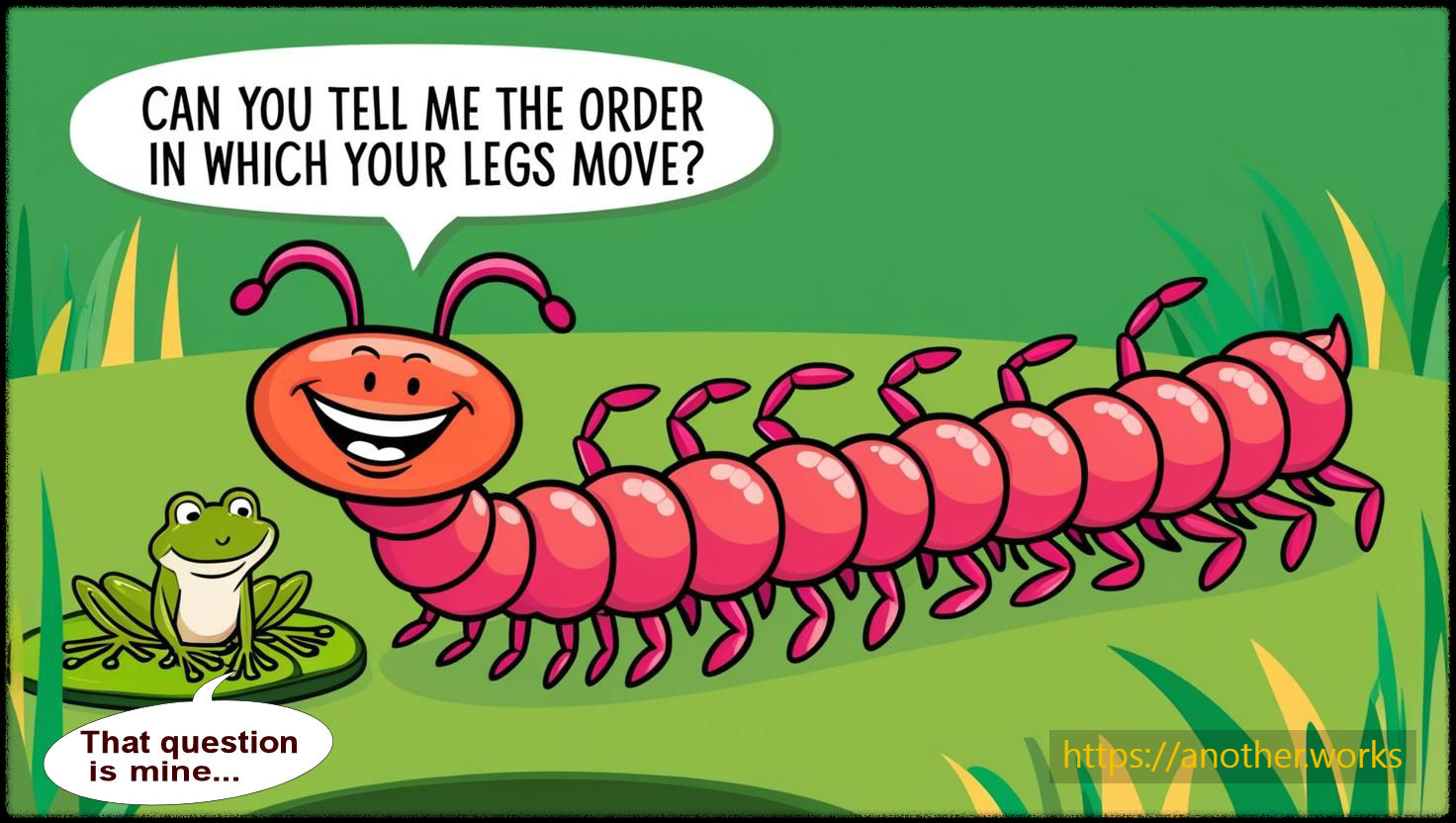 지네는 그 문제를 깊이 생각해 보았다. 지네는 난생 처음 그것을 의식하게 된 것이다. 지네는 자신의 다리를 내려다보았다. 아, 이 무수한 다리들! 지네는 깜짝 놀라 당황하지 않을 수 없었다. 그리고는 결국 그 자리에서 넘어지고 말았다.
