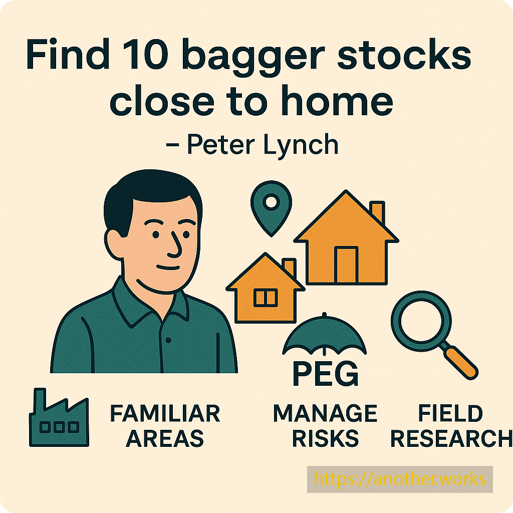 "10배 주식은 집 근처에서 찾아라"는 린치의 조언처럼, 개인 투자자는 익숙한 분야에서 단순한 비즈니스 모델을 가진 기업을 발굴하고, PEGR과 현장 조사를 통해 리스크를 관리해야 합니다. 그의 원칙은 복잡한 분석보다 실생활 관찰과 지속적 학습을 강조합니다.