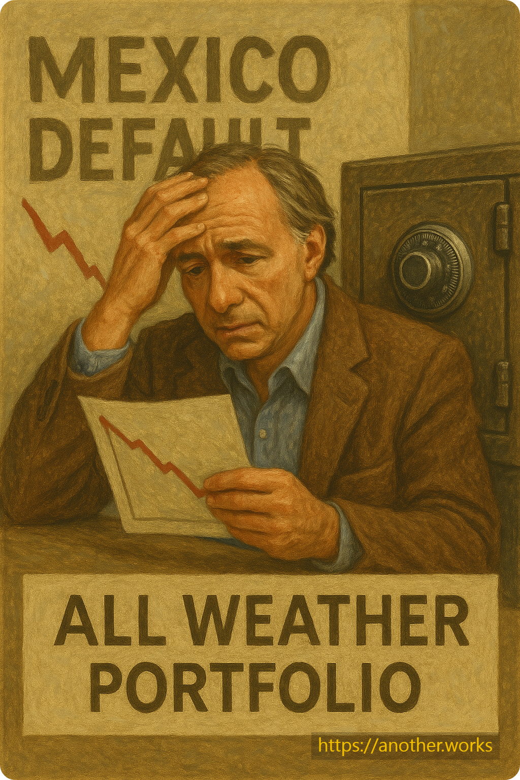 레이 달리오는 1982년 멕시코 채무불이행 사태로 인한 경기침체 예측 실패로 거의 모든 재산을 잃었습니다. 이 경험은 그에게 "예측 불가능한 시장에 대비하는 전략"의 중요성을 깨닫게 했습니다. 이후 그는 가족의 자산을 장기적으로 보호하기 위해 모든 경제 상황에 대응할 수 있는 포트폴리오를 설계했는데, 이가 바로 "올웨더 전략"입니다. 이 전략은 경제 성장과 인플레이션의 4가지 조합(높은/낮은 성장, 높은/낮은 인플레이션)에 따라 자산을 분산해 리스크를 관리합니다[1][7].